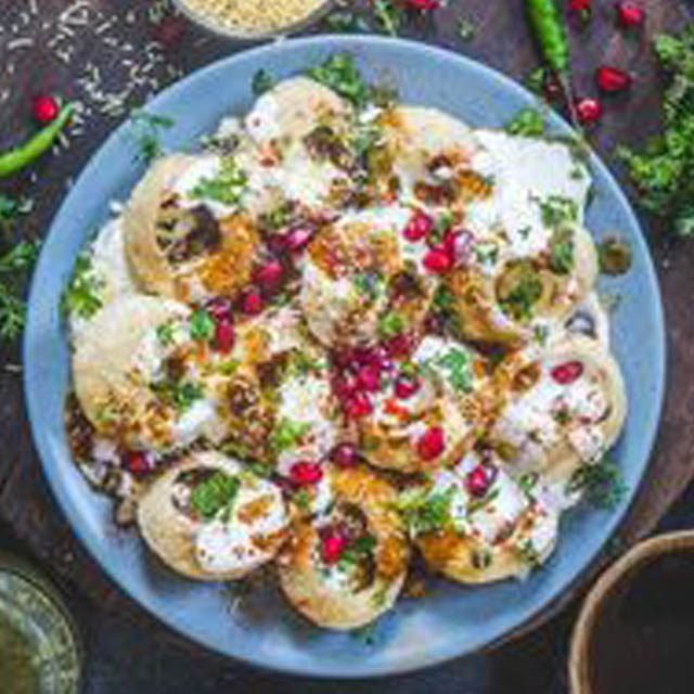 Crispy puris filled with spiced potatoes, creamy yogurt, tangy tamarind chutney, and a sprinkle of chaat masala, creating a perfect burst of sweet, tangy, and spicy flavors!