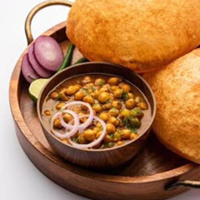 Two deep fried wheat flour bread served with chickpea gravy, yogurt and salad