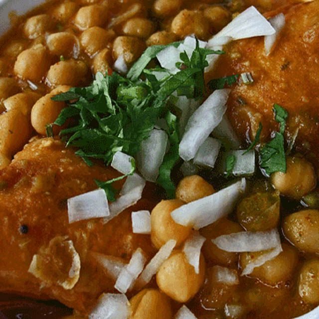 Crispy pastry filled with spiced potatoes and peas, served with chickpeas in a tangy sauce, garnished with fresh cilantro and onions.